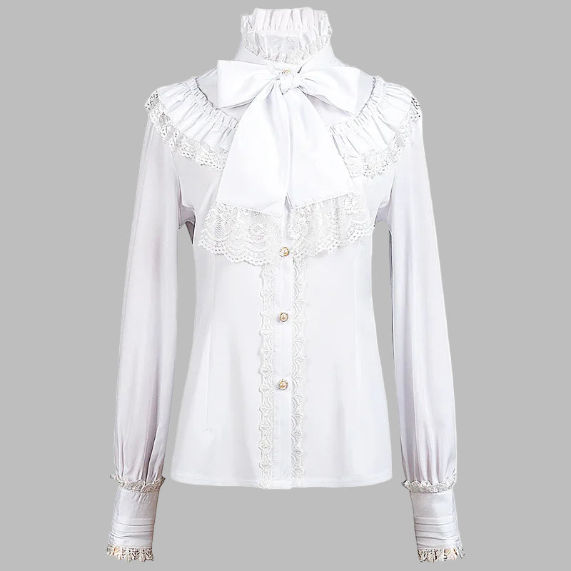 Bluză steampunk albă cu aplicații din dantelă și fundă