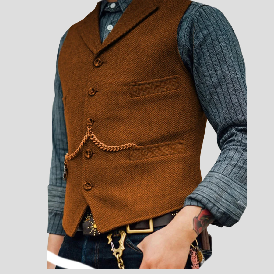 Vestă rock maro cu lanț, model vintage cu imprimeu herringbone și finisaj elegant
