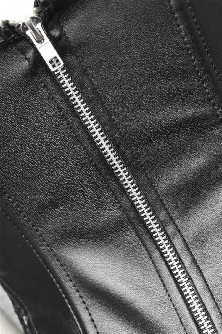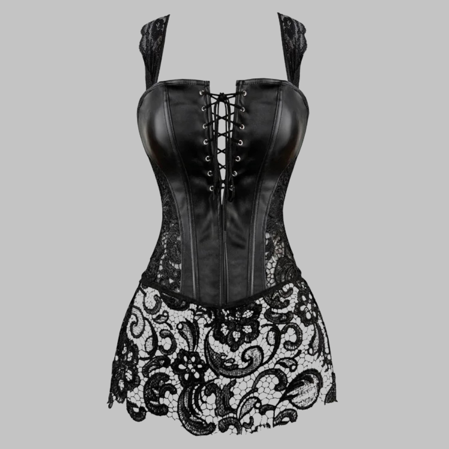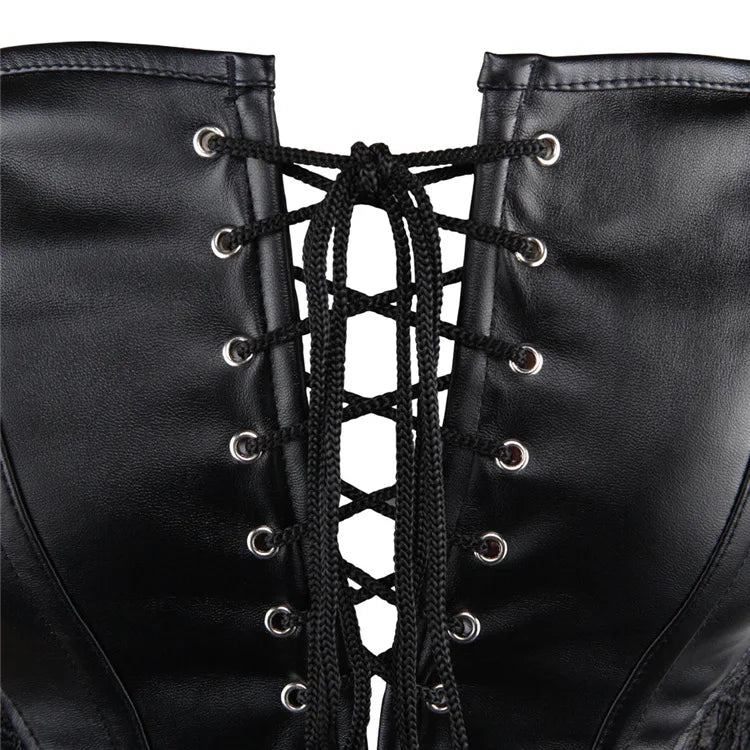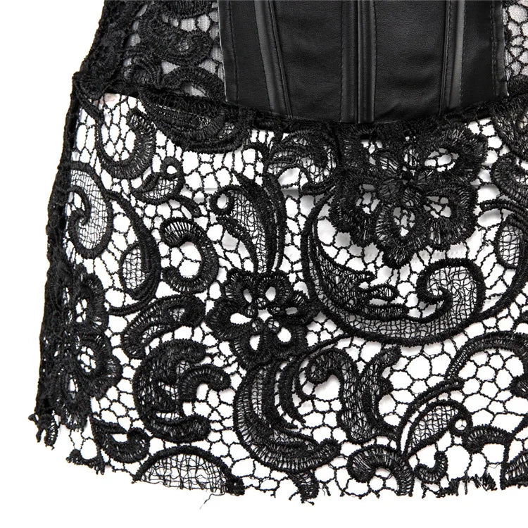 Corset negru din piele ecologică cu dantelă florală – stil burlesc