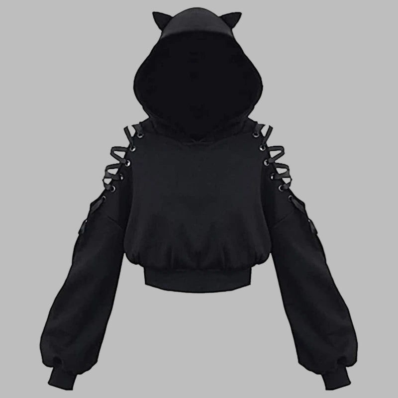 Hanorac punk negru cu coarne și șireturi pe umeri
