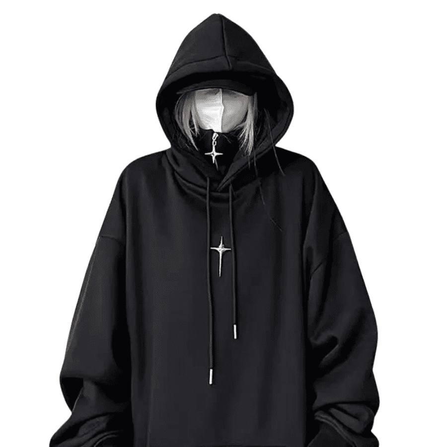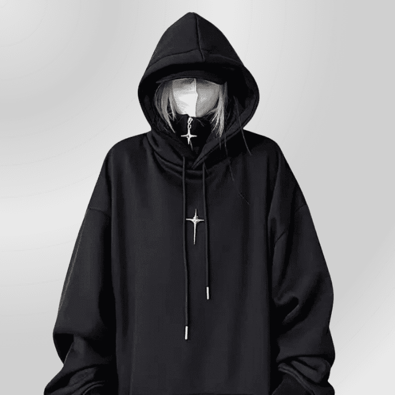 Hanorac negru gotic grunge cu glugă, stil techwear, negru