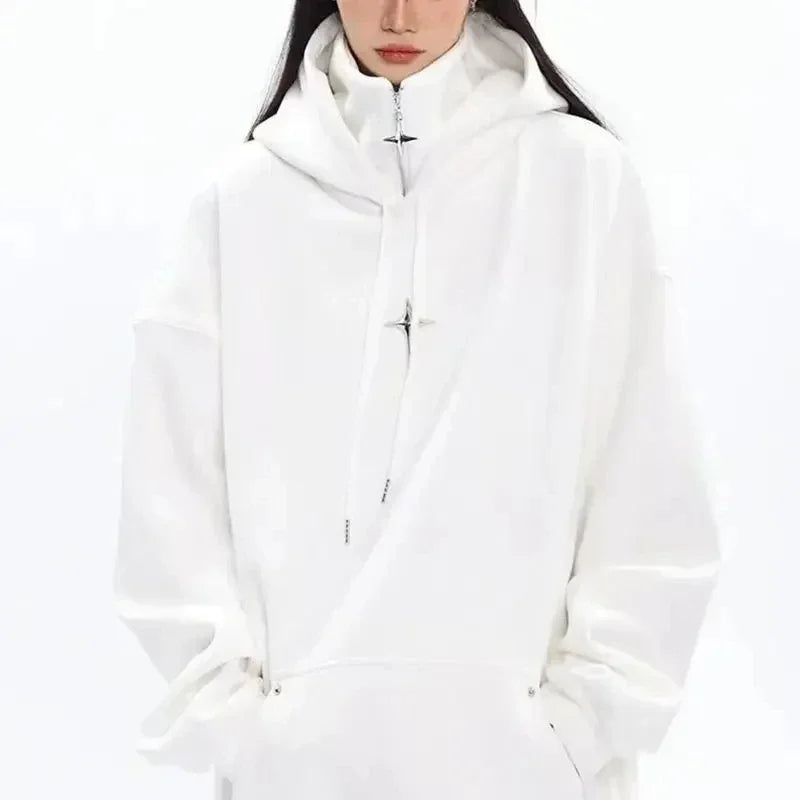 Hanorac negru gotic grunge cu glugă, stil techwear, alb
