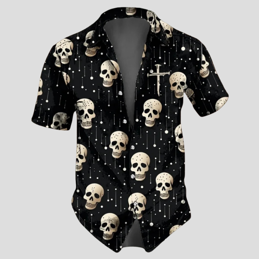 Cămașă punk neagră cu cranii și cruci, cu mânecă scurtă