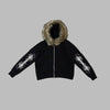 Geacă punk neagră cu glugă îmblănită și modele metalice