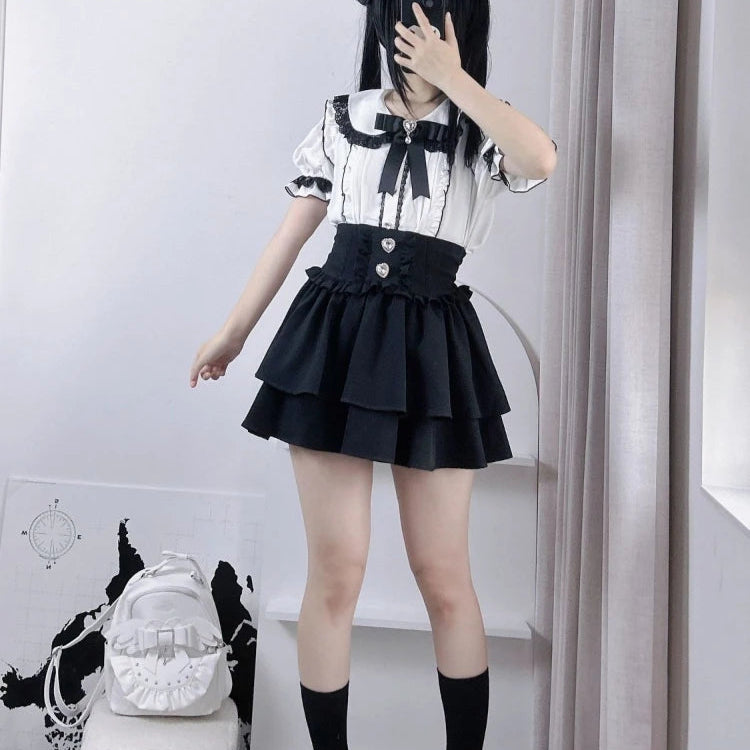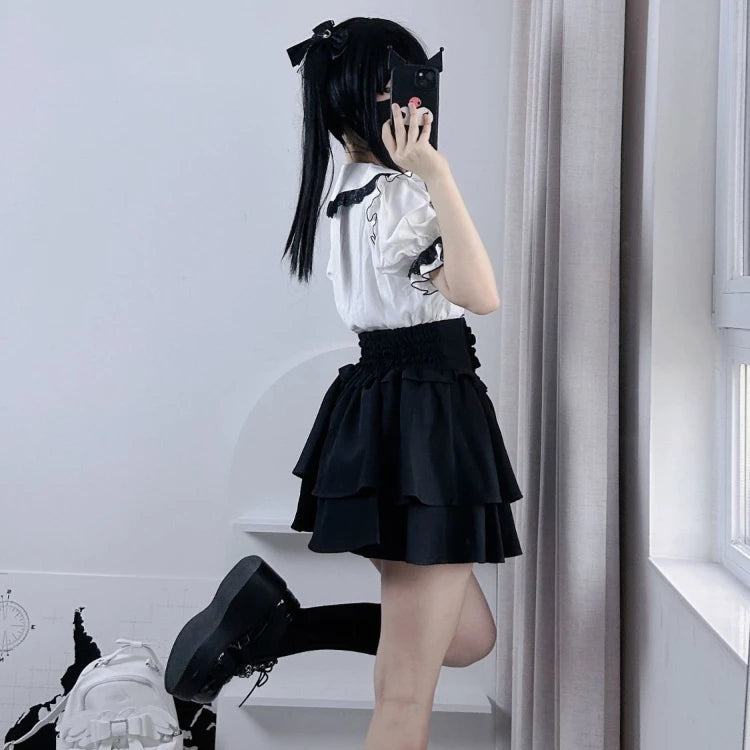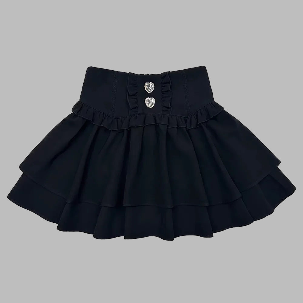 Fustă neagră Jirai Kei cu volane și nasturi decorativi
