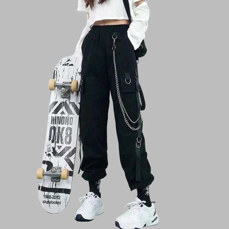 Pantaloni negri gotic punk cu lanțuri și buzunare cargo metal