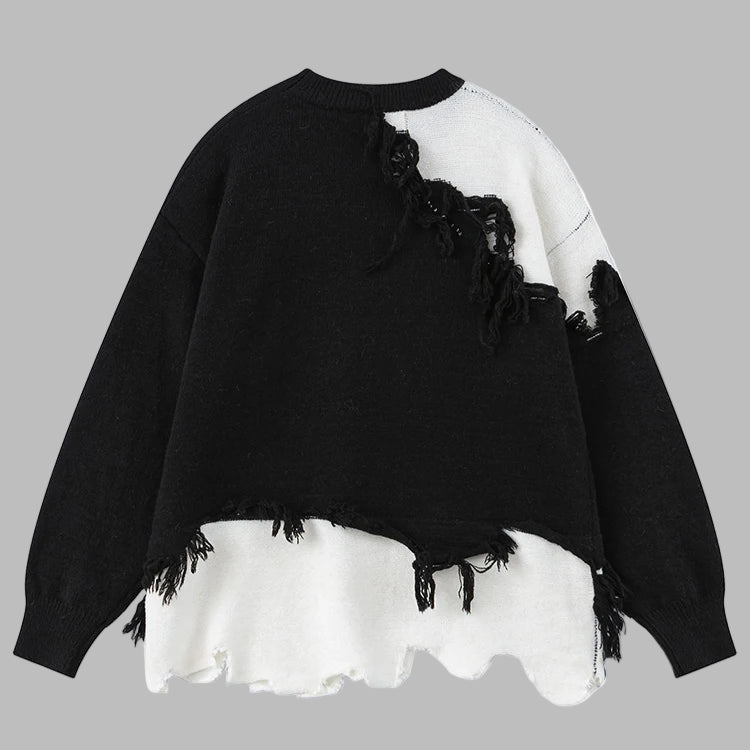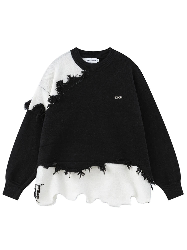 Pulover punk alb-negru cu rupturi și franjuri Vezi opțiunile