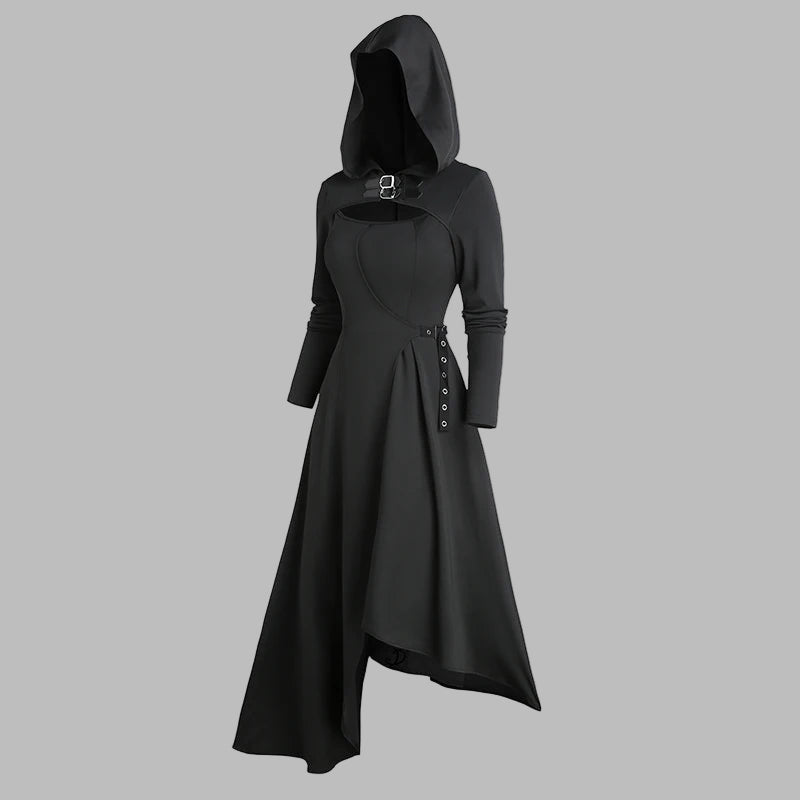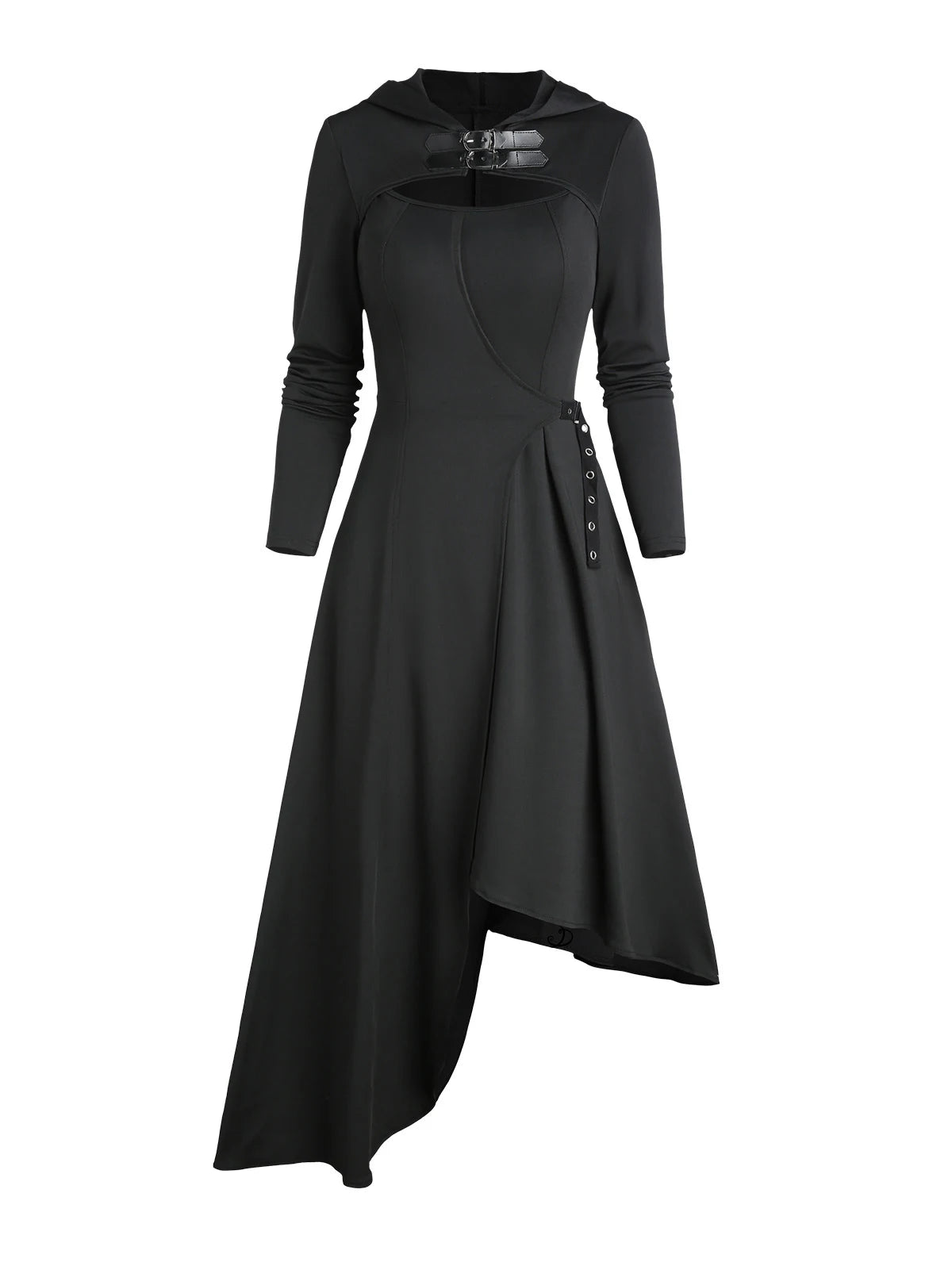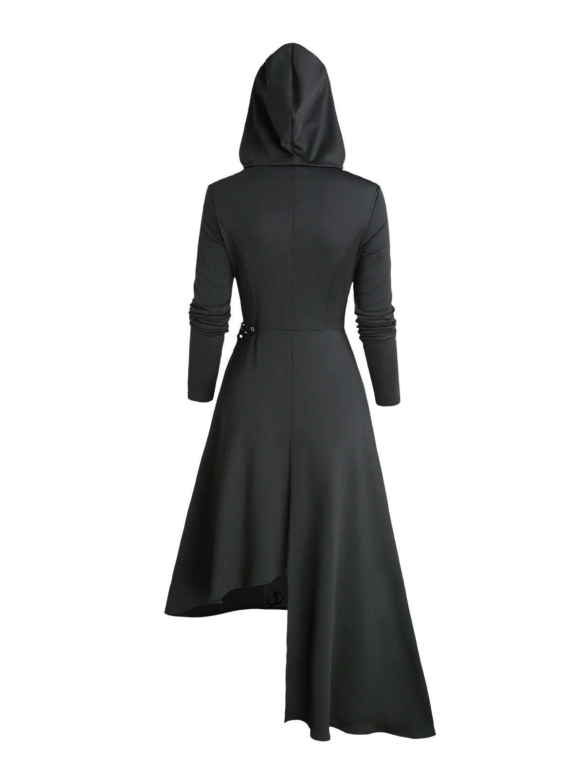 Palton lung negru asimetric cu glugă și curea Vezi opțiunile