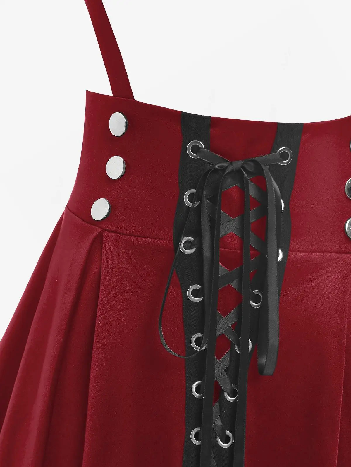 Fustă roșie Jirai Kei cu bretele și șiret corset