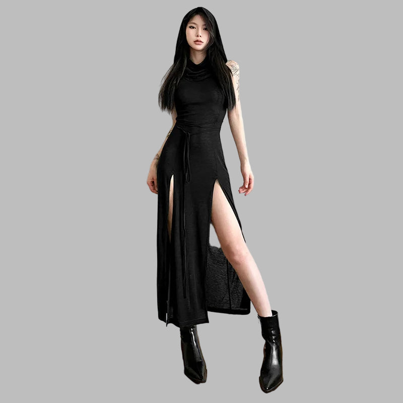 Rochie lungă neagră rock cu guler înalt și despicături