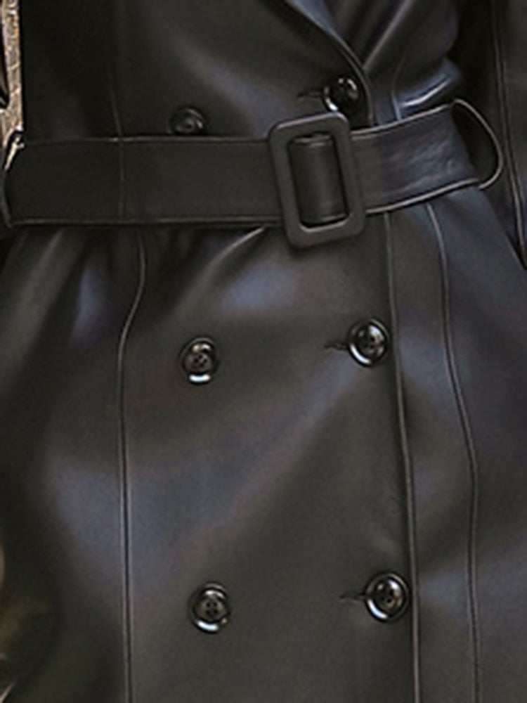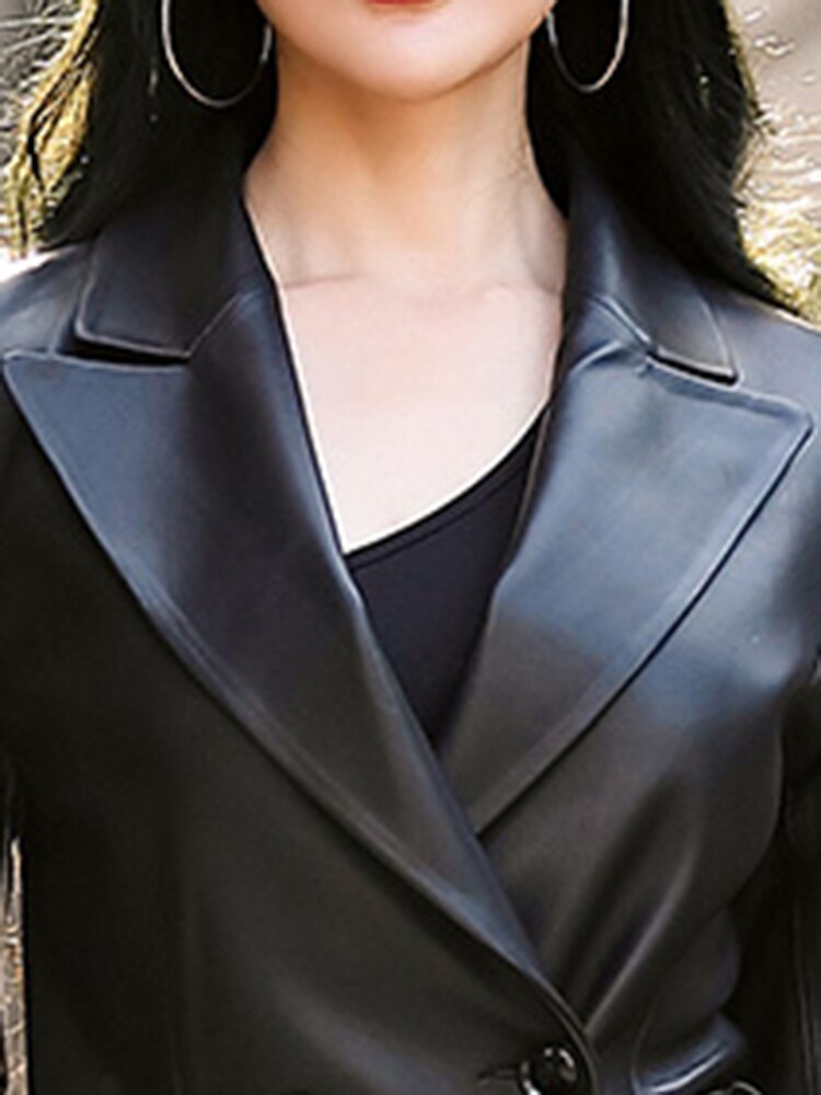 Pentru a obține un stil deosebit și elegant, acest palton pentru femei a fost realizat din piele ecologică de culoare neagră, din mai multe motive: