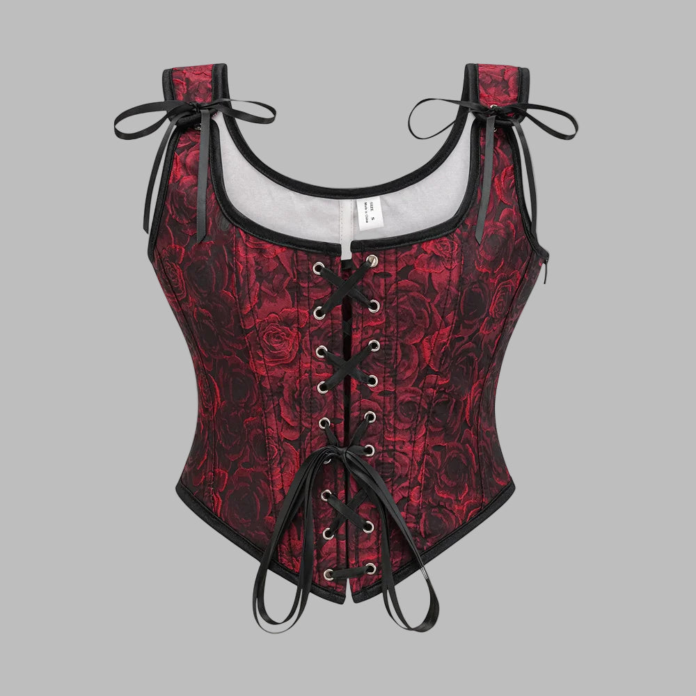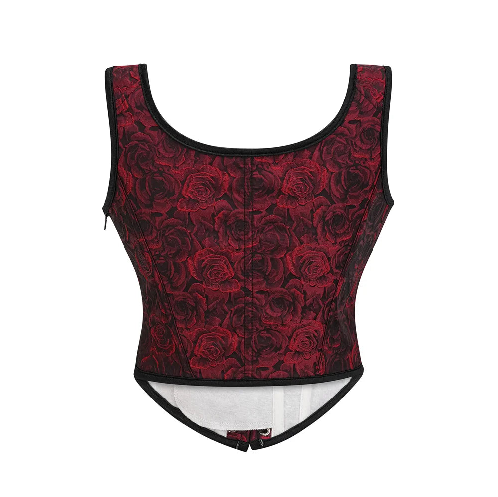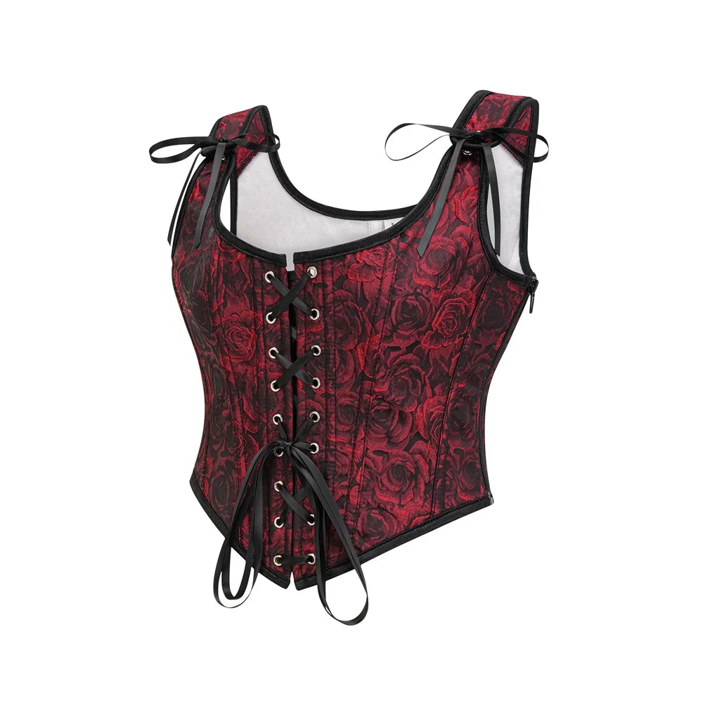 Corset gotic roșu-negru cu dantelare, imprimeu cu trandafiri și bretele