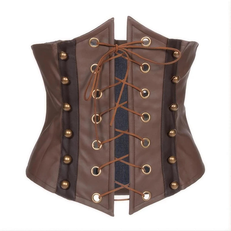 Corset steampunk maro din piele, cu șnur corset și nasturi