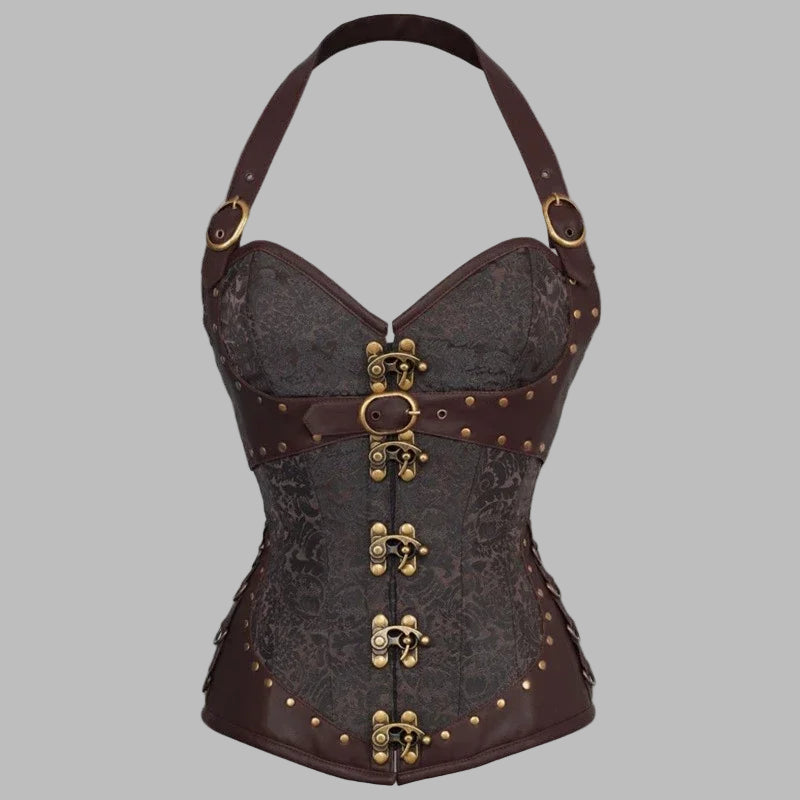 Corset steampunk maro cu model sclipitor și catarame metalice pentru femei