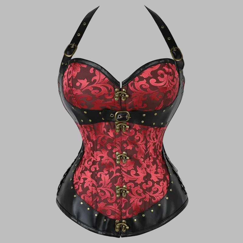Corset steampunk roșu din brocart cu elemente din piele neagră și catarame