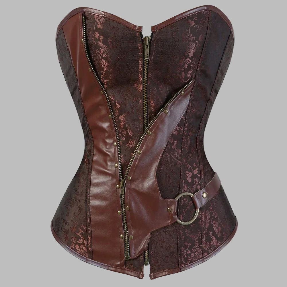 Corset steampunk maro din brocart, cu fermoar și curea cu inel