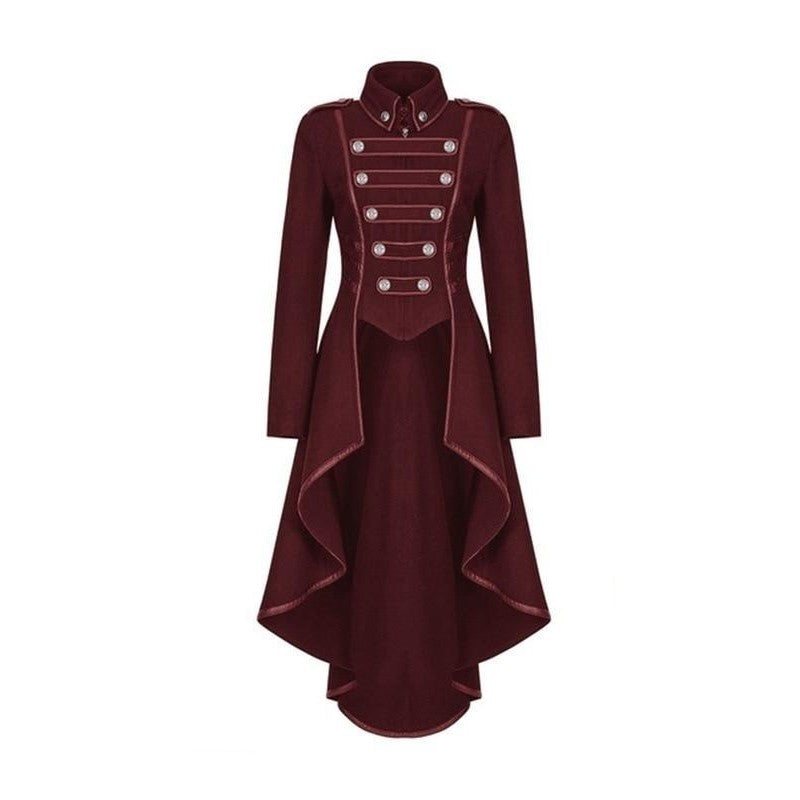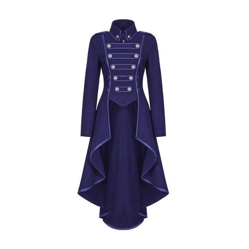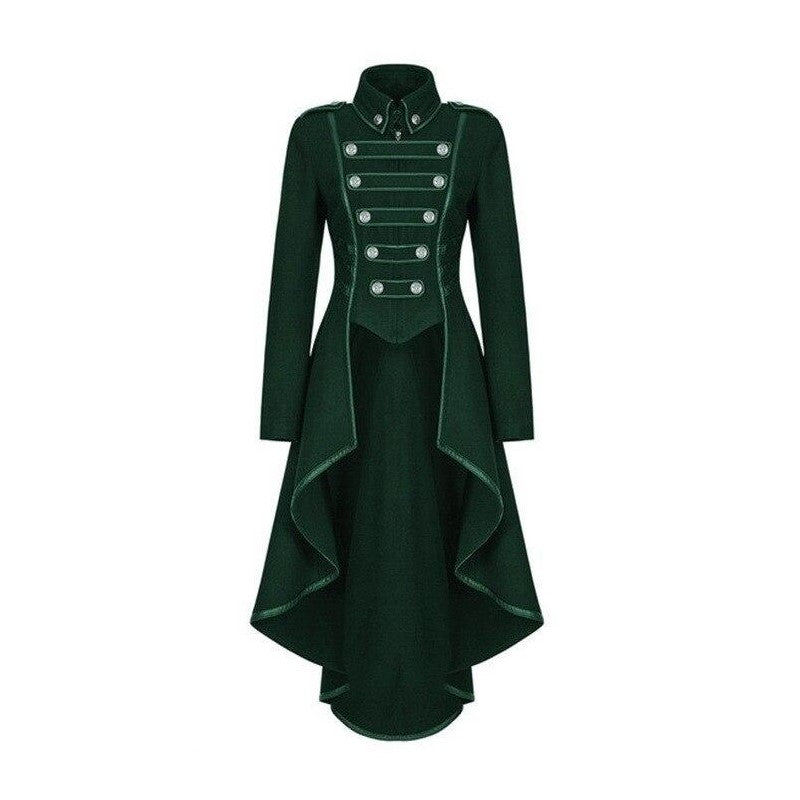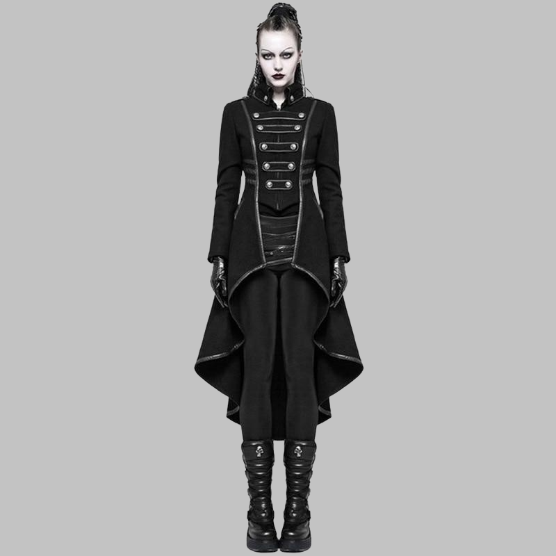Acest model este un sacou gotic de damă cu coadă. Asta înseamnă că spatele sacoului este mai lung, iar țesătura cade într-o formă elegantă, asemănătoare unei cozi. Pe lângă avantajele estetice, o astfel de croială protejează de ploaie și acoperă o parte mai mare a corpului.
