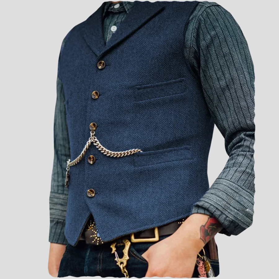 Vestă steampunk bleumarin cu lanț pentru ceas de buzunar, model chevron