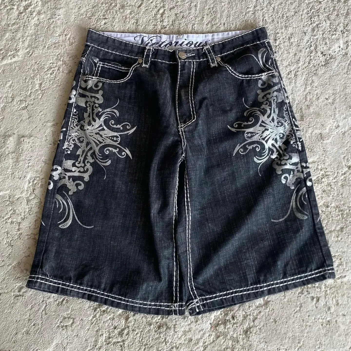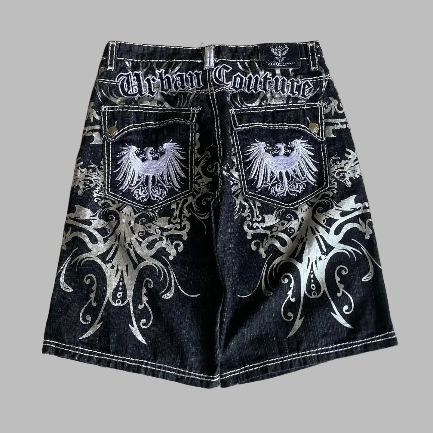 Pantaloni scurți grunge din denim, stil metal, cu vulturi și motive tribale