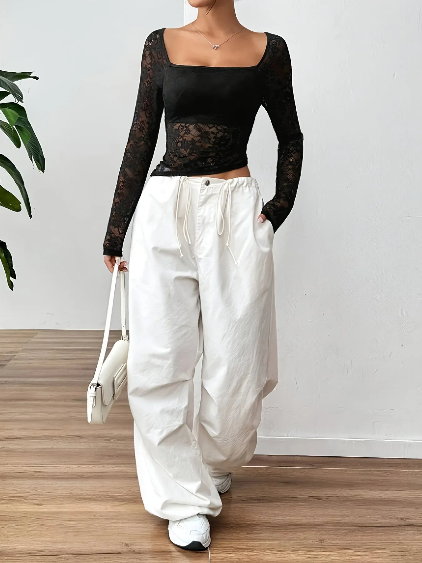Top negru mulat din dantelă transparentă cu mâneci lungi Vezi opțiunile