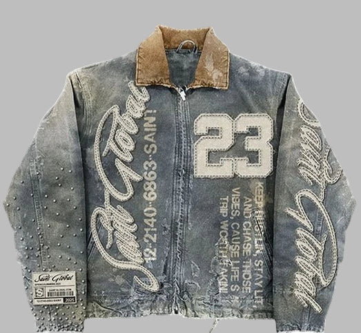 Geacă de blugi rock grunge metal cu inscripții și ținte, vintage