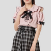 Bluză Jirai Kei roz roz, cu fundă neagră, mânecă scurtă