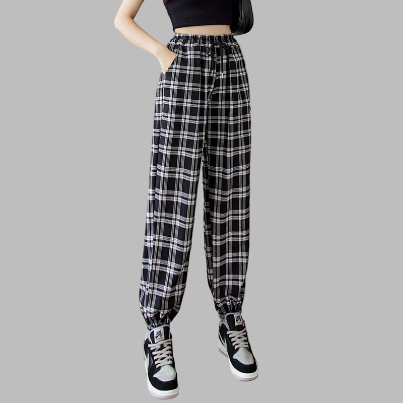 Pantaloni jogger Jirai Kei cu carouri alb-negru