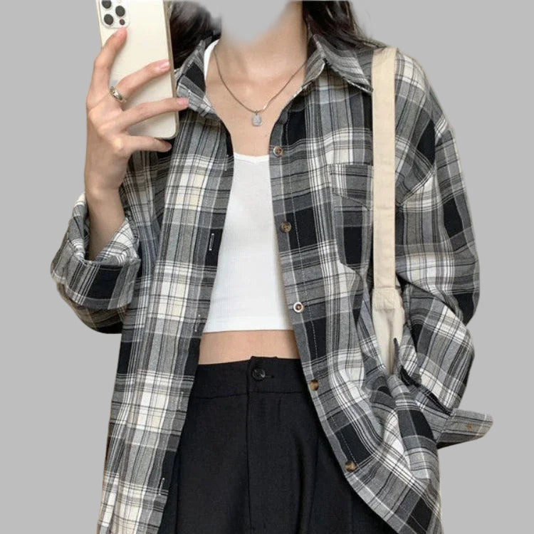 Cămașă flanelată oversize în carouri alb-negru, stil punk rock