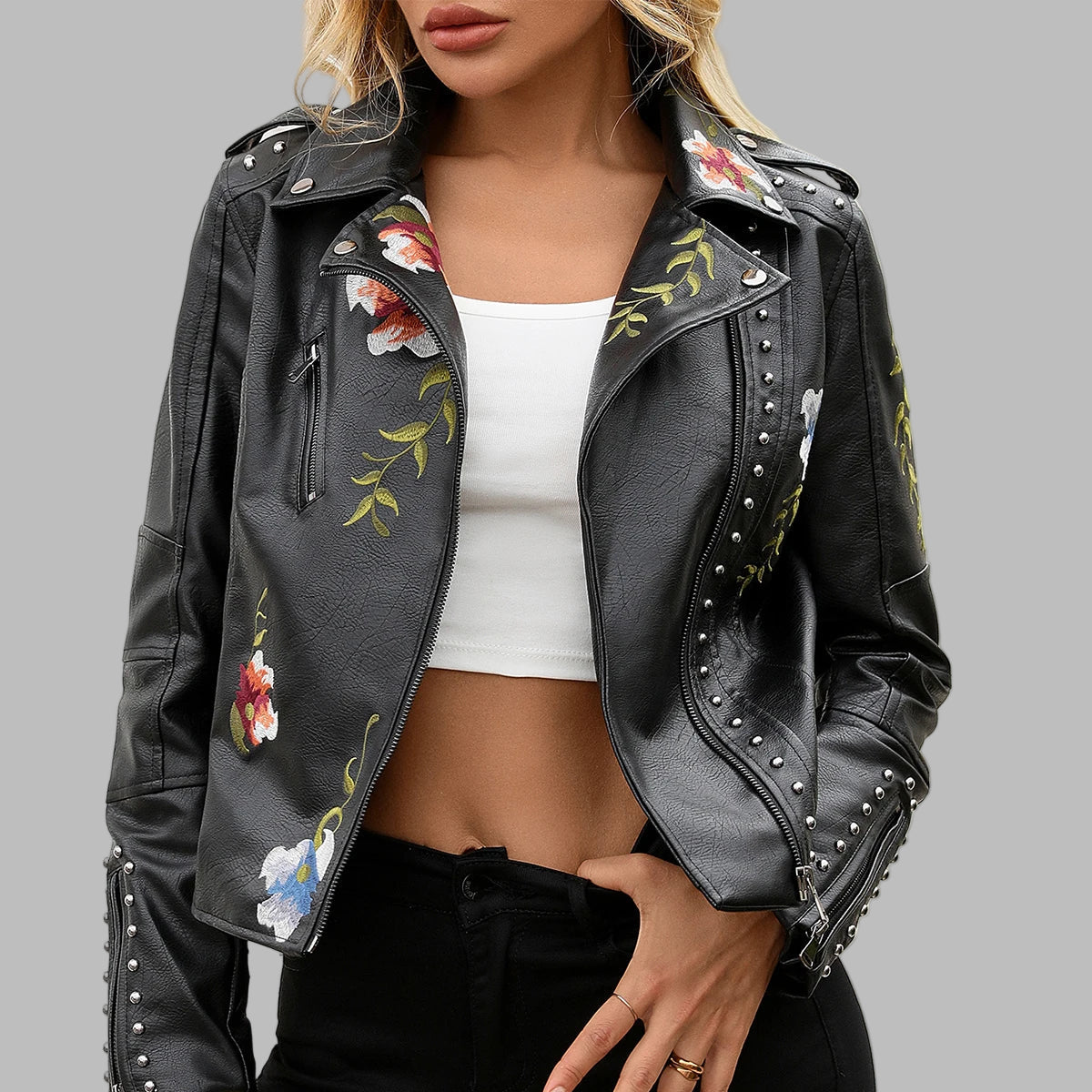 Geacă gotică din piele neagră cu ținte și broderii florale pentru femei