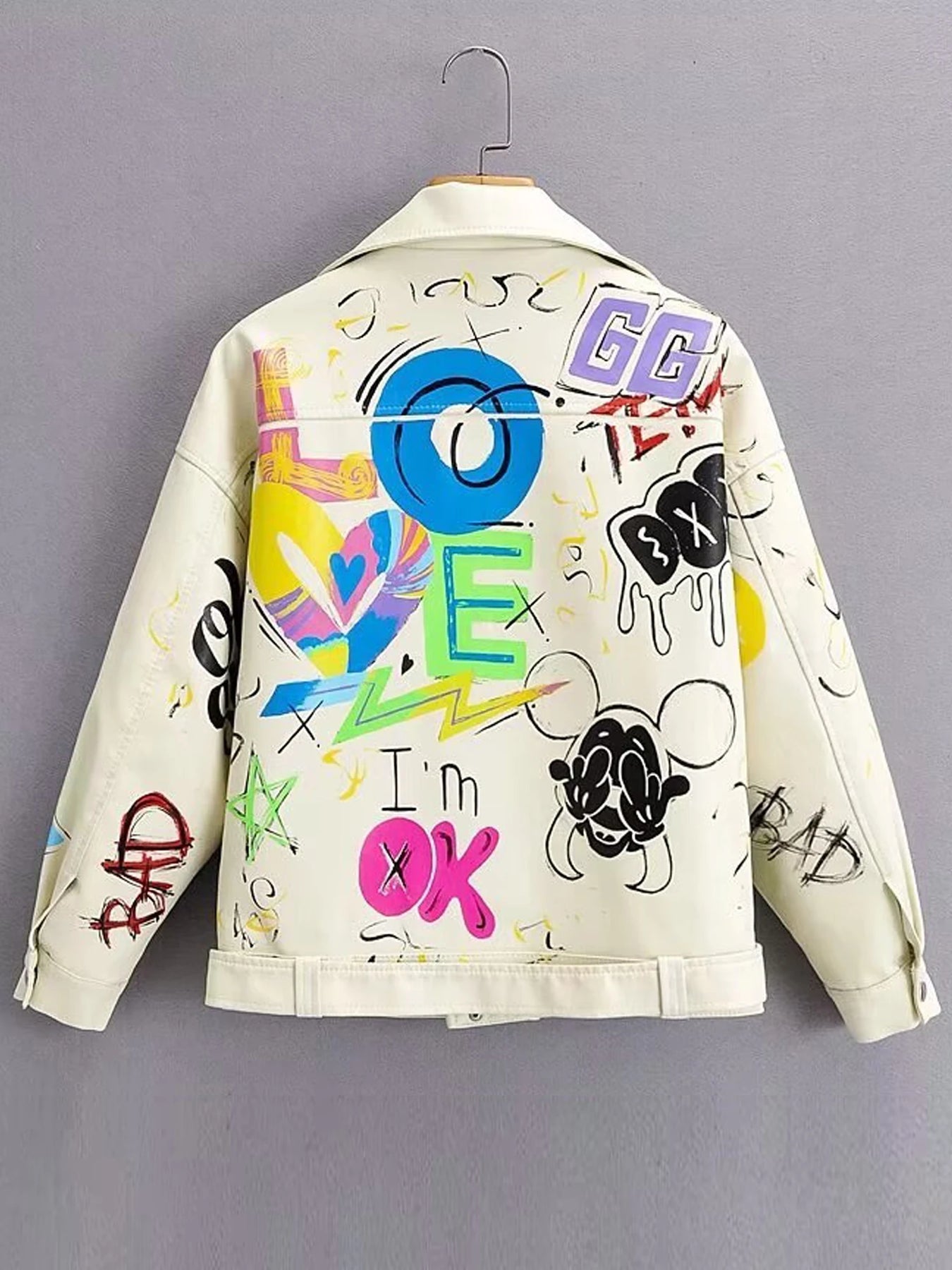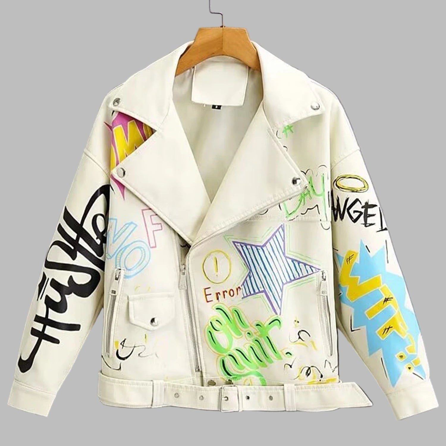 Geacă biker albă din piele cu graffiti punk Vezi opțiunile