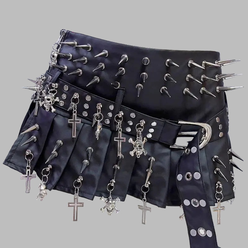 Fustă plisată neagră metal cu ținte și lanțuri