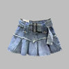 Fustă scurtă albastră din denim, stil punk, cu curea și pliuri