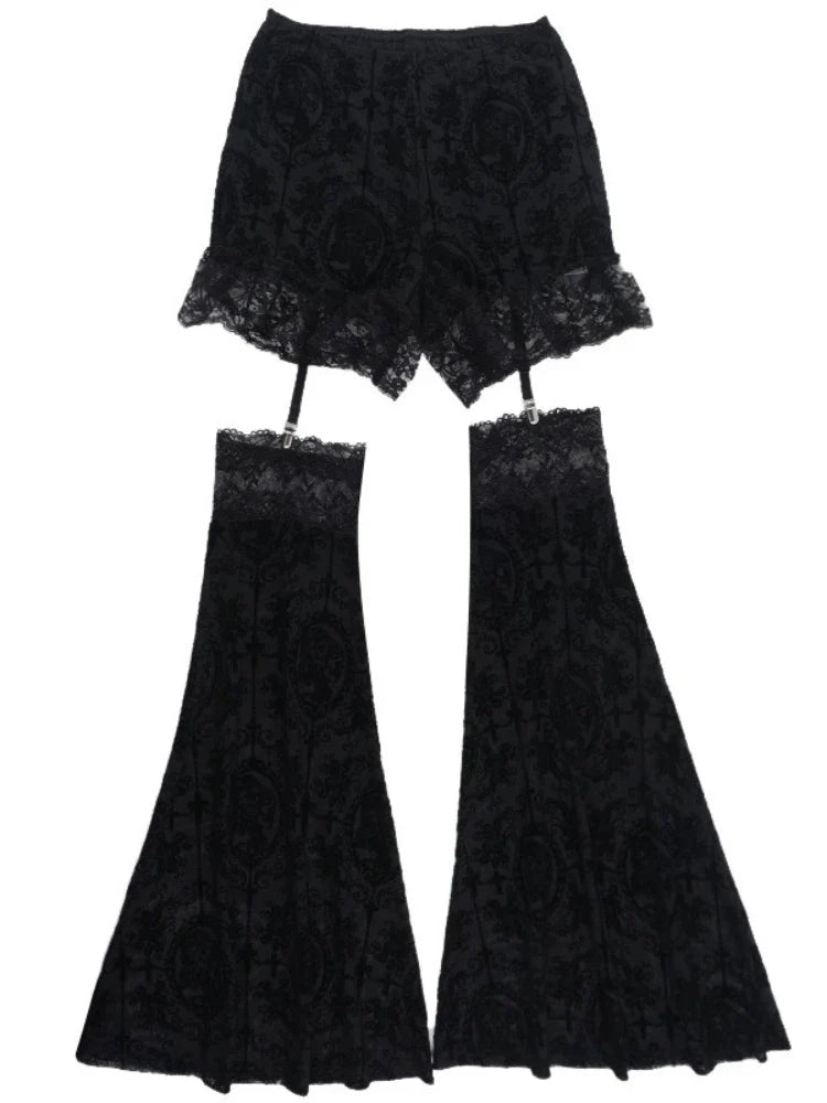 Pantaloni evazați negri gotici din dantelă cu fustiță scurtă