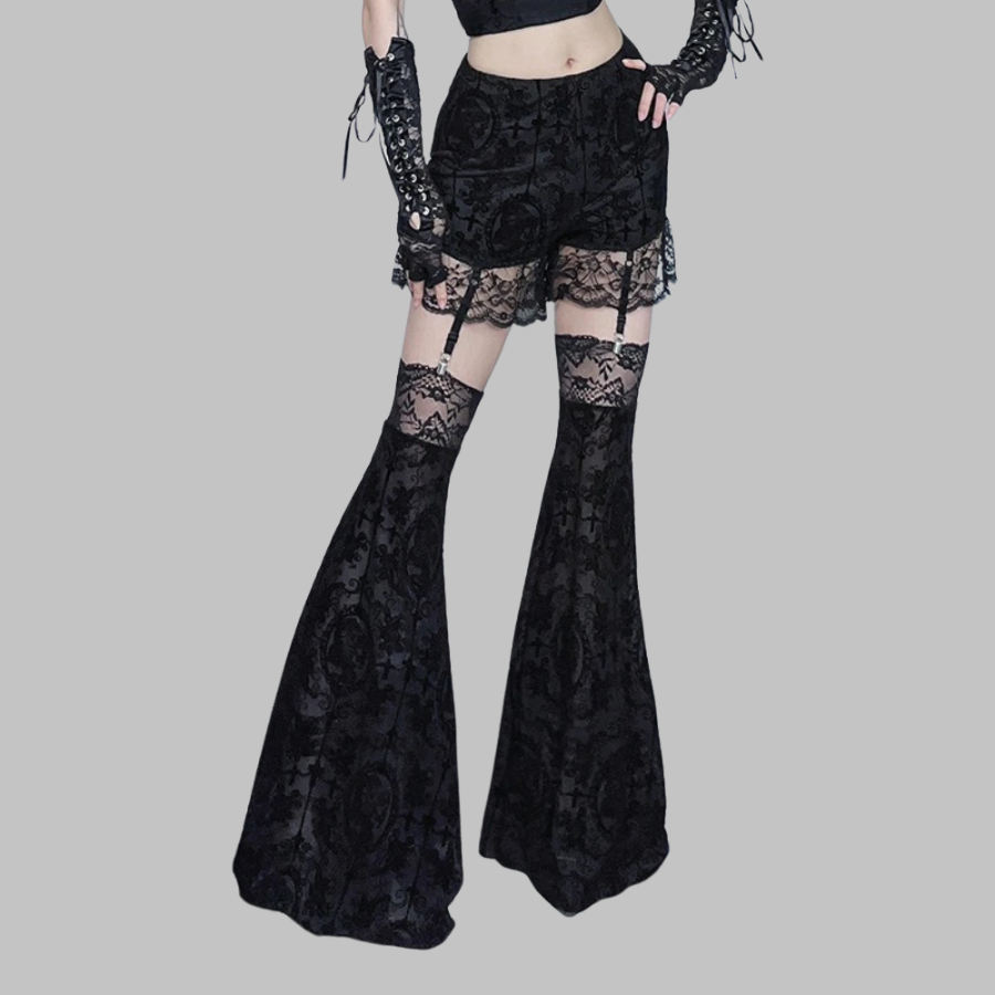 Pantaloni evazați negri din dantelă, stil gotic, cu fustiță scurtă