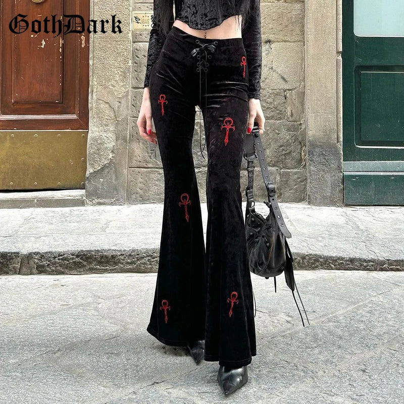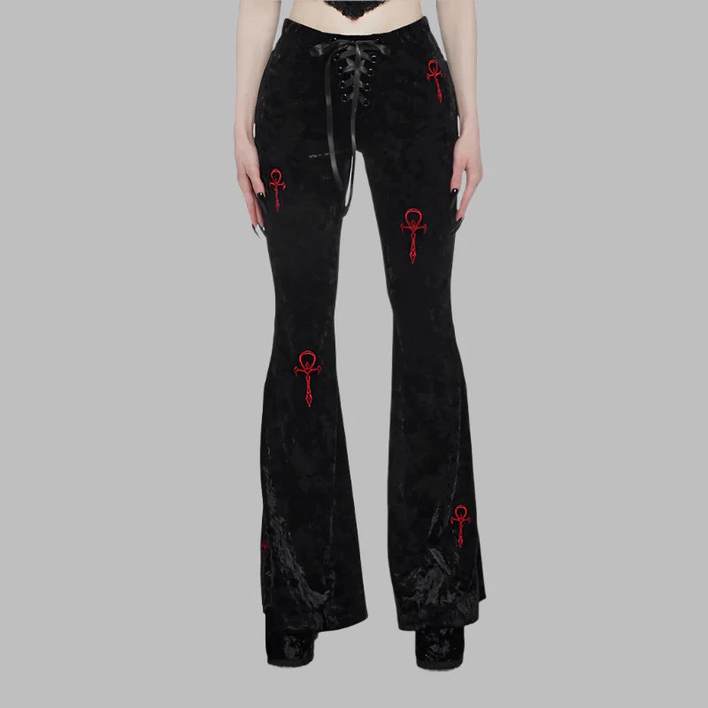 Pantaloni negri gotici din catifea, cu talie înaltă și cruci roșii brodate