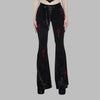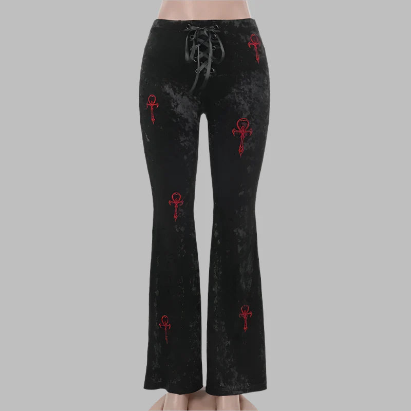 Pantaloni negri gotici din catifea cu talie înaltă și cruci roșii brodate
