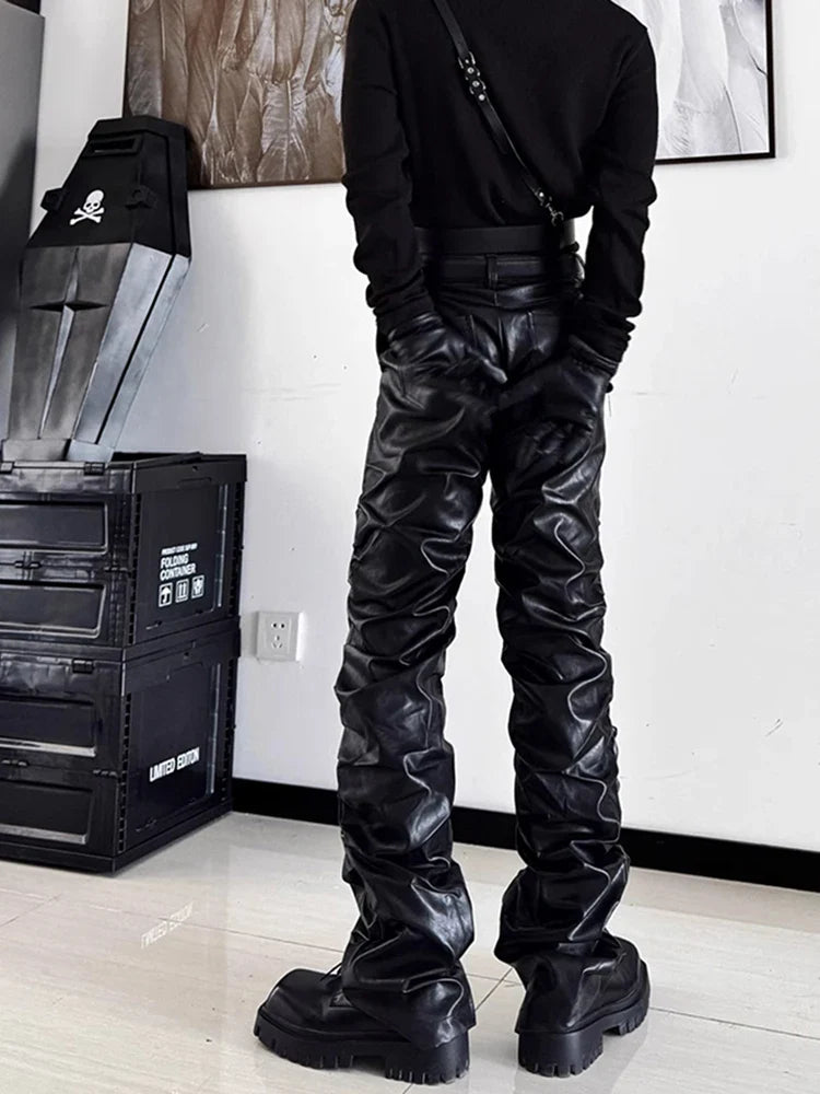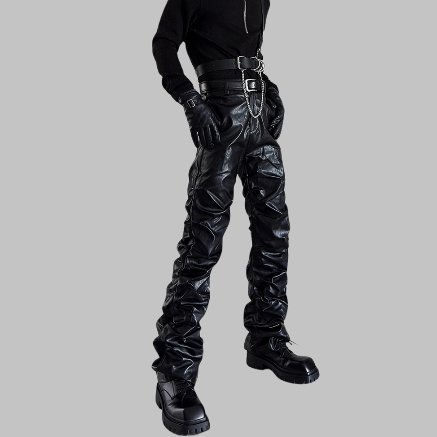 Pantaloni negri gotici din piele ecologică cu lanțuri și curea