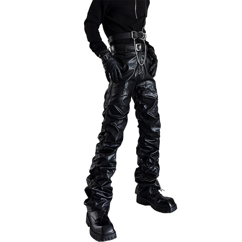 Pantaloni gotici negri din piele ecologică cu lanțuri și curea