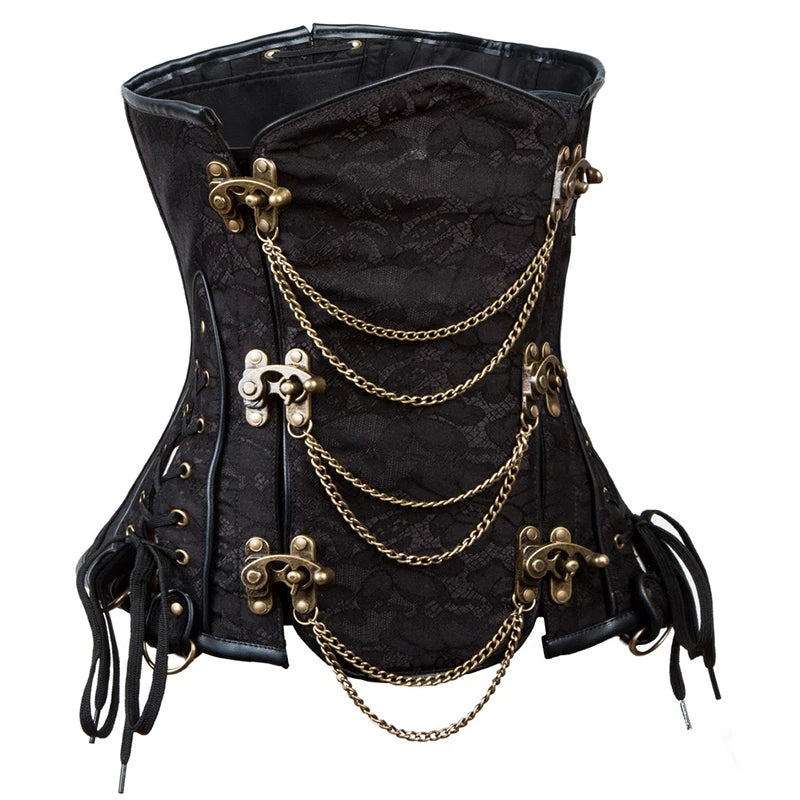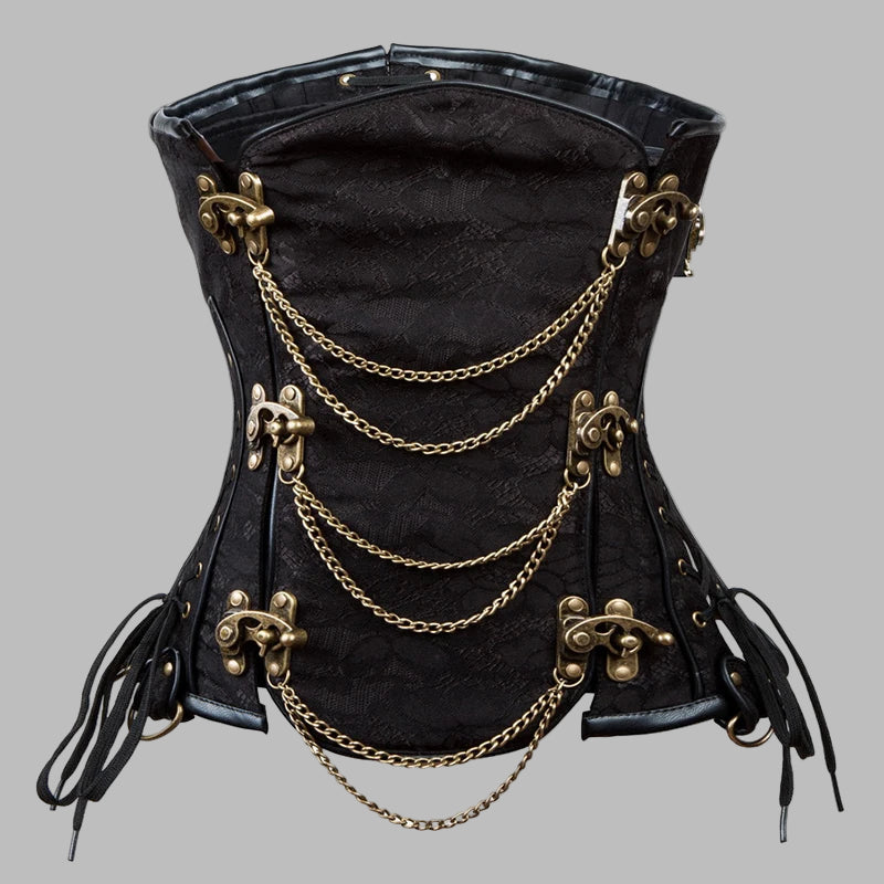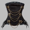 Corset negru punk gotic, cu lanțuri, catarame aurii, stil steampunk