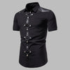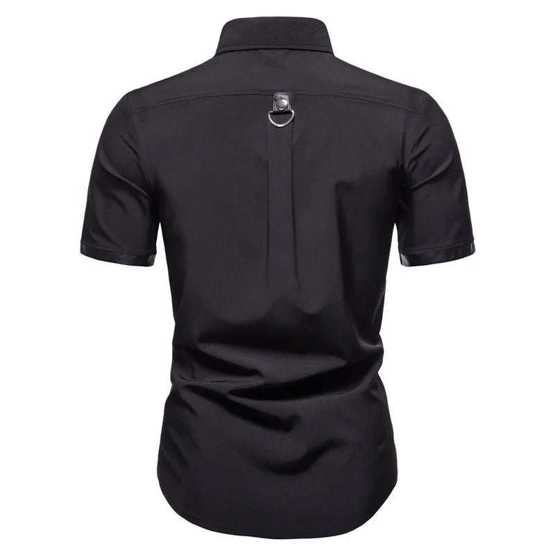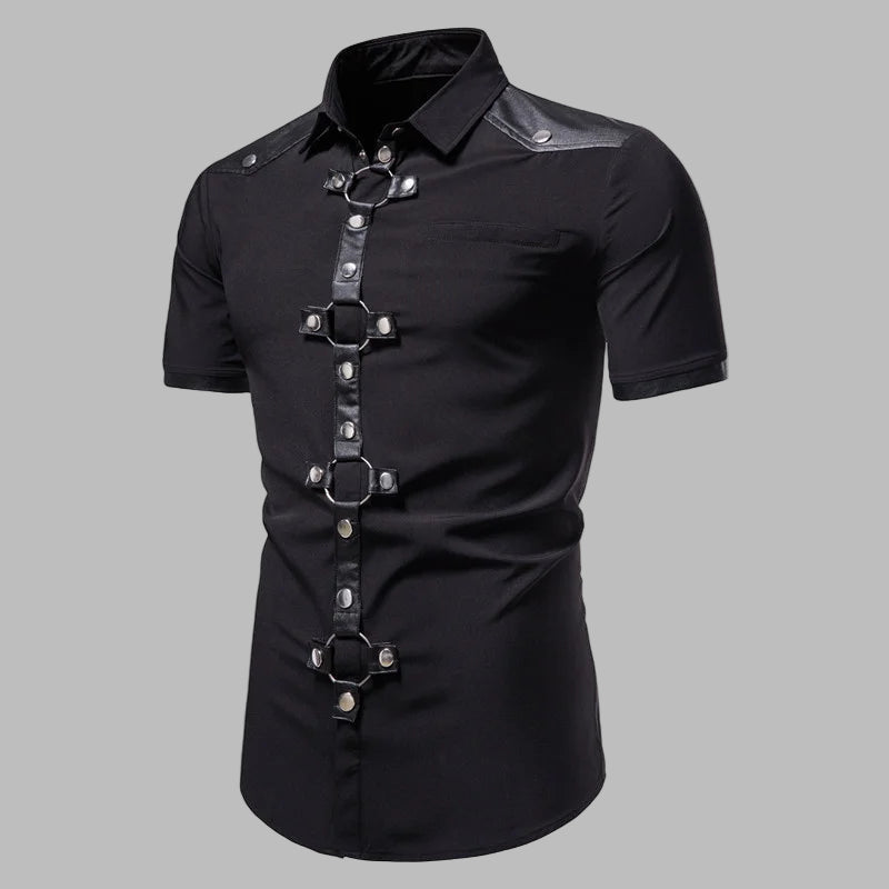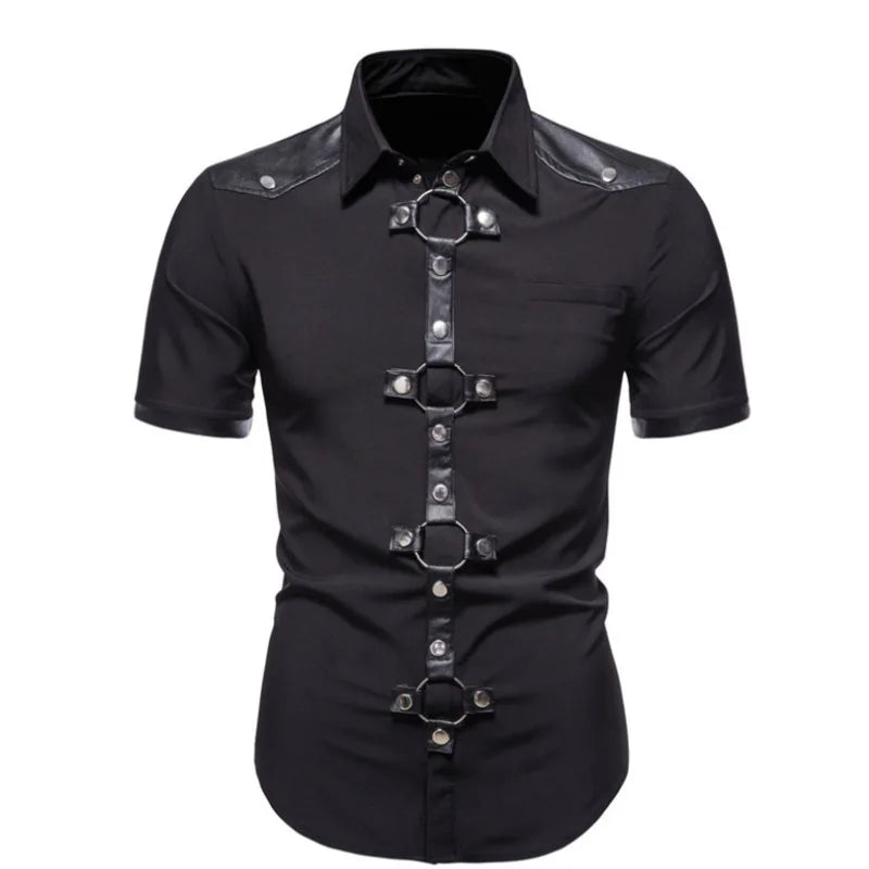 Cămașă punk neagră cu inele și bretele metalice, cu mânecă scurtă