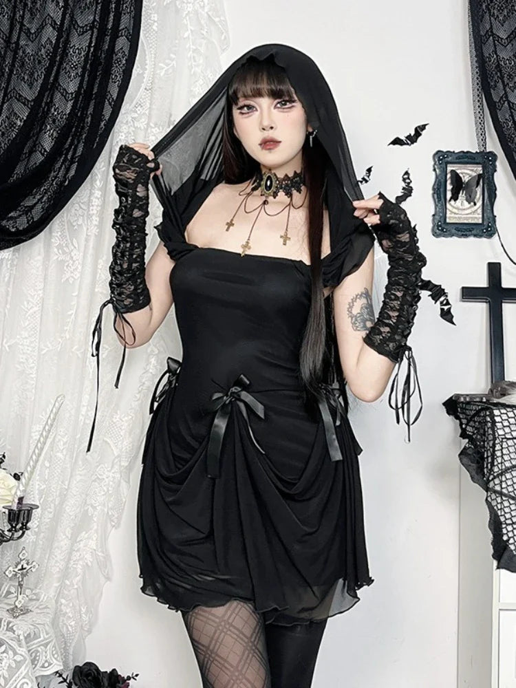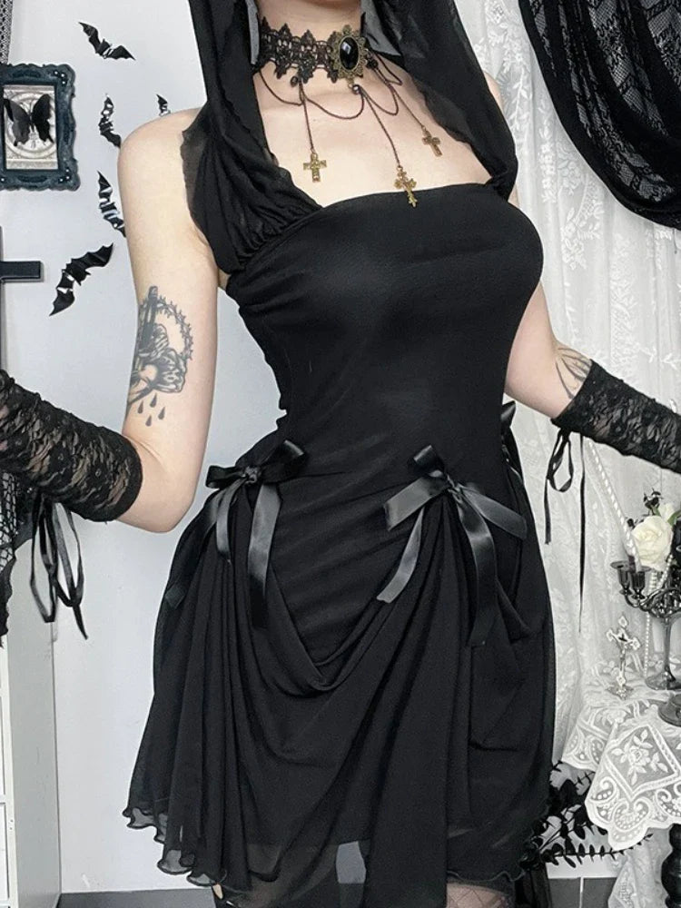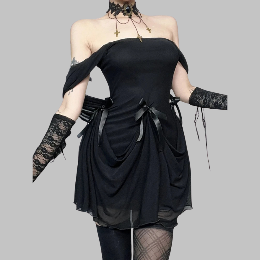 Rochie neagră grunge cu mâneci lungi și fustă drapată Vezi opțiunile