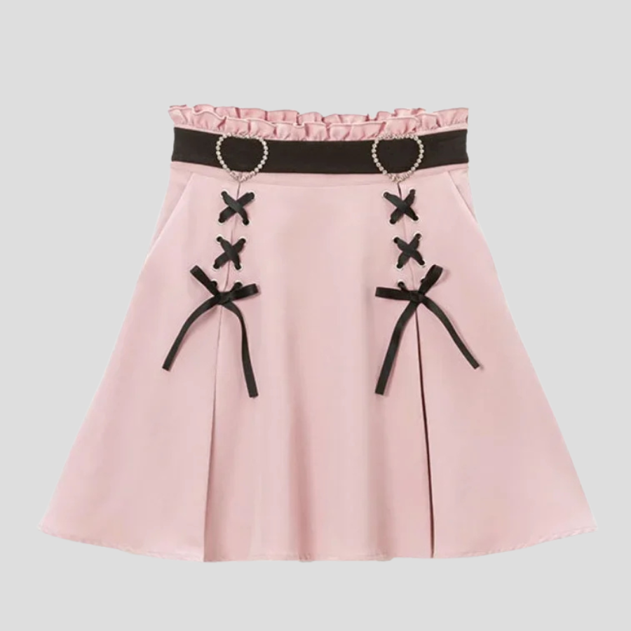 Fustă roz Jirai Kei cu șiret tip corset și fundițe