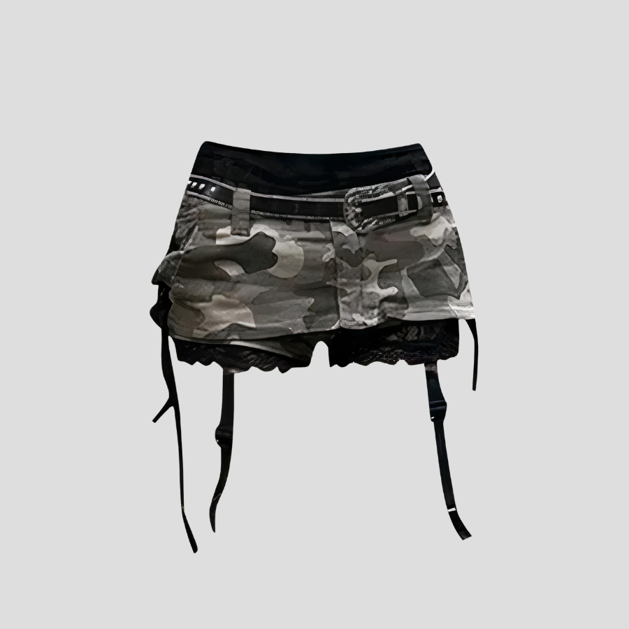 Pantaloni scurți damă punk camuflaj, cu dantelă și curea