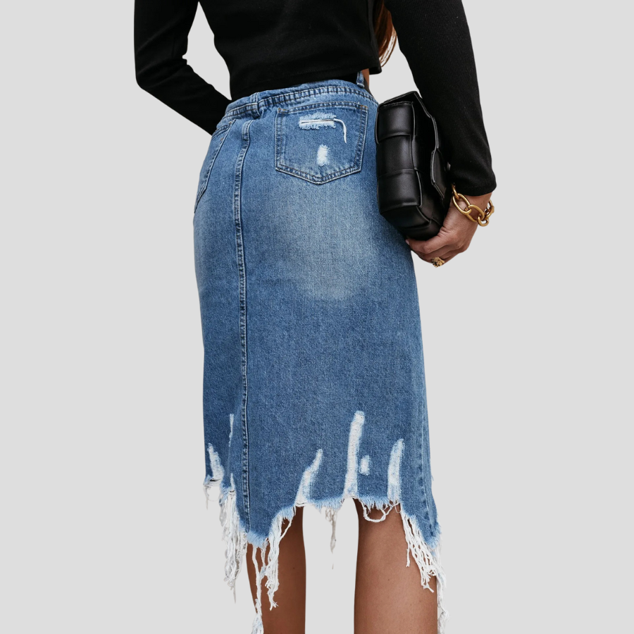 Fustă lungă de damă din denim, stil grunge, cu tiv franjurat