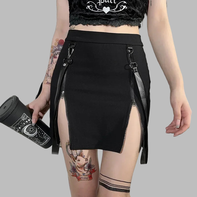 Fustă mini gotică neagră cu fermoare și bretele straps