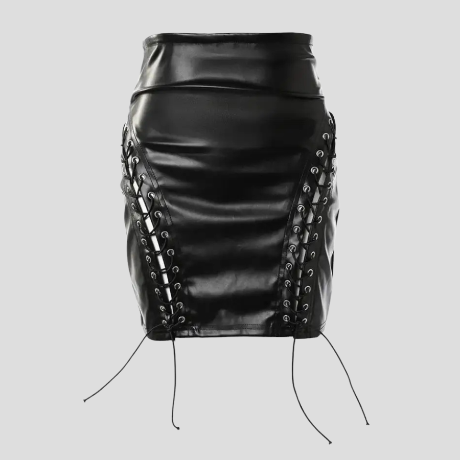 Fustă gotică scurtă neagră din piele, mulată, cu șireturi