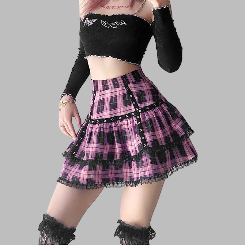 Fustă în carouri Punk Rock Grunge cu finisaj din dantelă