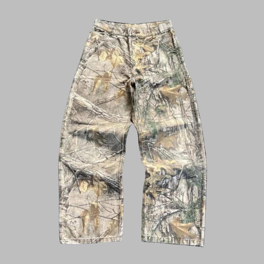 Pantaloni cargo bej cu camuflaj cu frunze Techwear