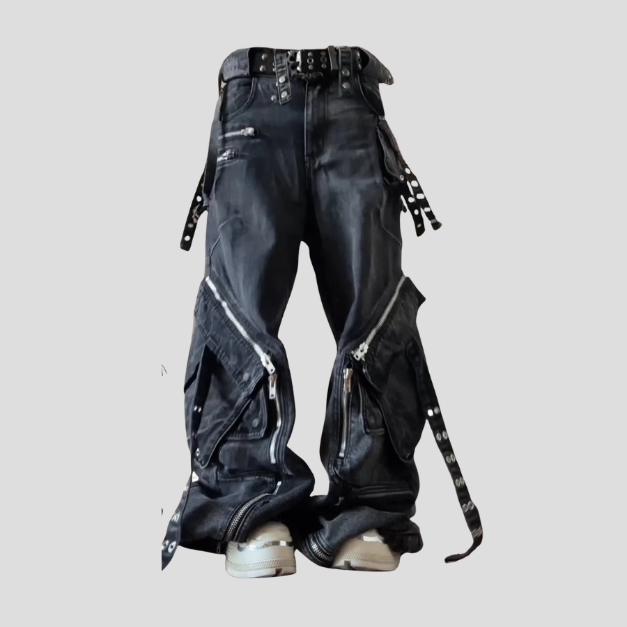 Pantaloni cargo bărbați negri cu fermoare, curele și buzunare, stil punk techwear