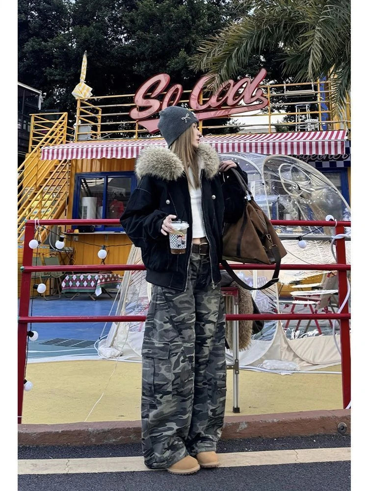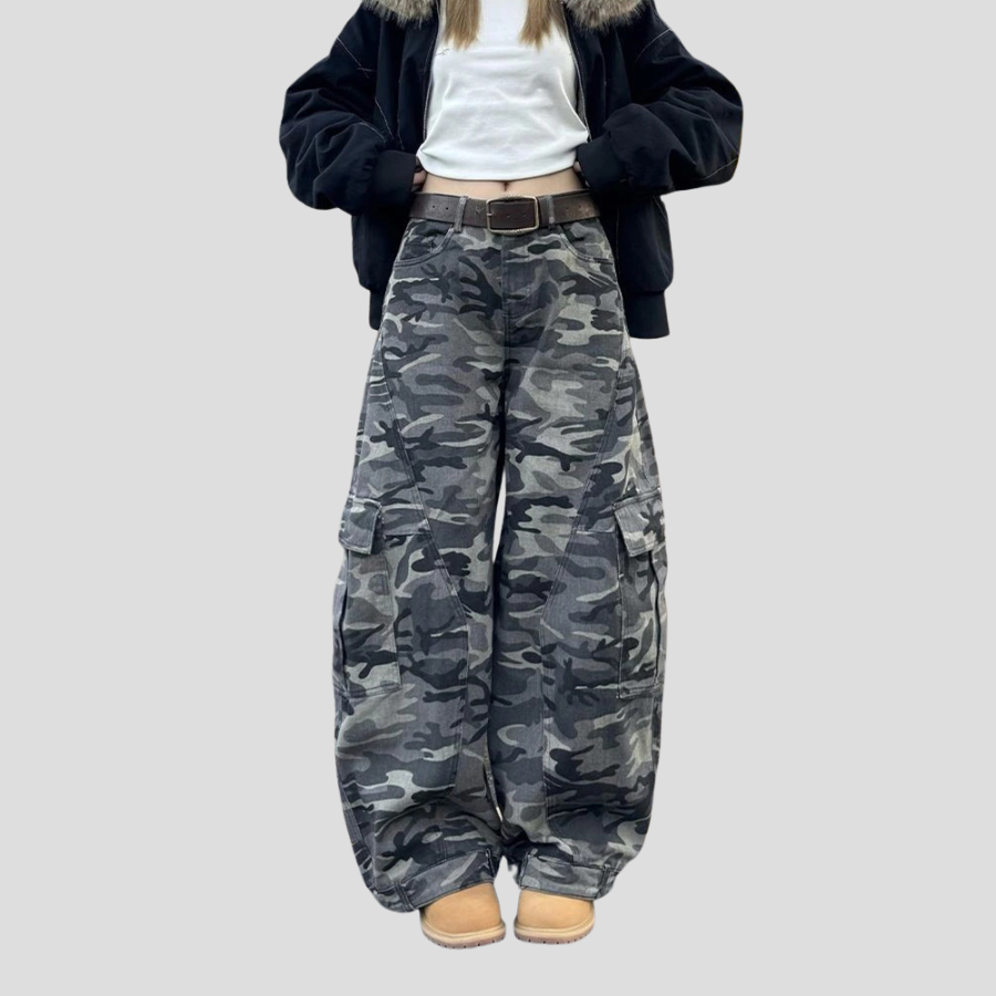 Pantaloni cargo damă camuflaj militar, oversize cu buzunare